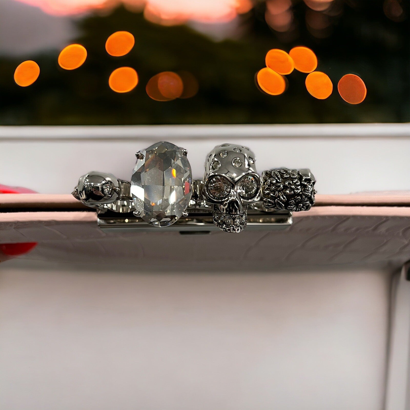 Gorgeous statement piece clutch that is bound to turn heads and be topic of conversation. Rare in this pale pink, stand out in the crowd of a sea or boring black bags. Would be perfect for a wedding, a dinner or brunch date, a baby shower...the possibilities are endless with this rare one-of-a-kind Alexander McQueen clutch.
