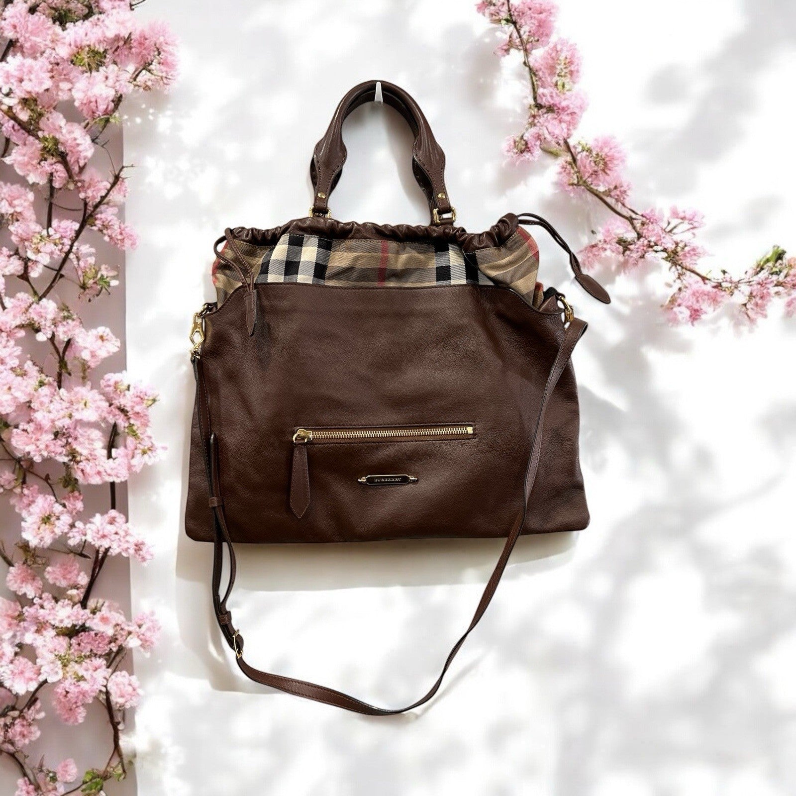 Burberry Big Crush Leather Plaid Drawstring Tote