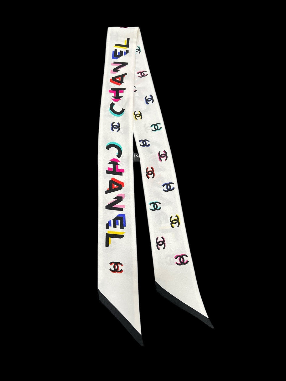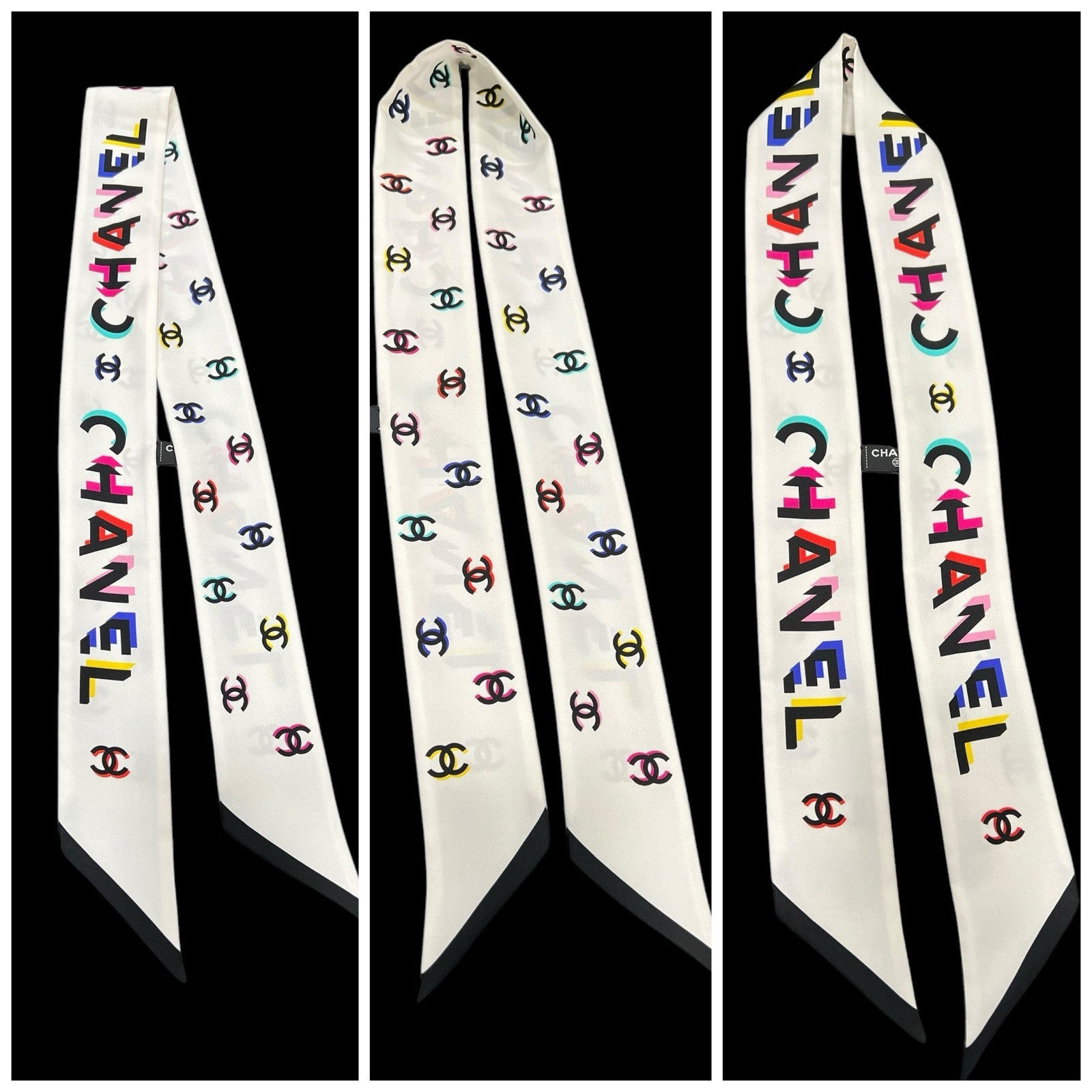 Chanel Silk Bandeau Scarf Ivory Multi Reversible Logo AUTHENTIC RARE