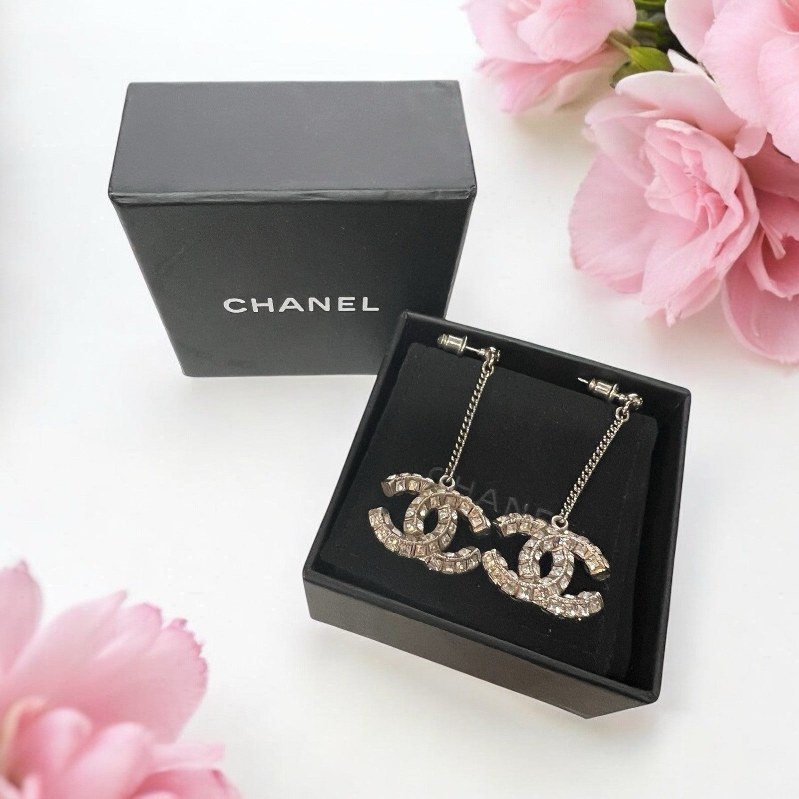 Chanel Silver Toned Crystal Drop Baguette Logo Earrings AUTHENTIC